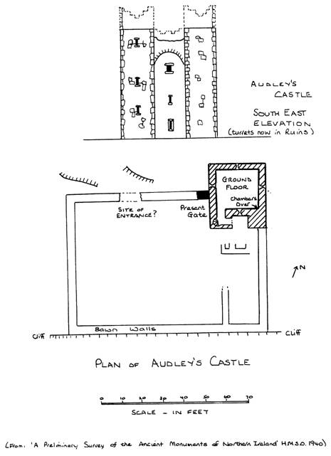 Henry is generally supposed to have built the first wooden castle here (just as he built Heleigh and founded Hulton Abbey). The ‘Preliminary Survey of the Ancient Monuments of Co. Down’ published by H.M.S.O. in 1940 interpreted the scarping of the sides of the rocky hillock on which Audley’s Castle stands as evidence of an earlier motte-type castle. Henry died in 1246 and his son James, who became Chief Justiciar at Dublin in 1271, and died in the following year, inherited Henry’s Irish lands. Several of James’ sons were ‘slain by the Welsh’ and it is generally thought that the likeliest candidates as progenitors of the Lecale Audleys are the younger sons of Henry. Two are mentioned in the records by name, Adam (1248) and Henry (1257), though it is thought that there were others.